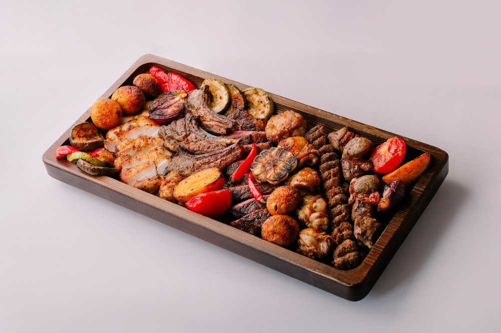 Рибай KAZBEEF, стейк курицы, люля кебаб, куриные бёдра, антрекот, шашлык из баранины, овощи гриль, грибы.