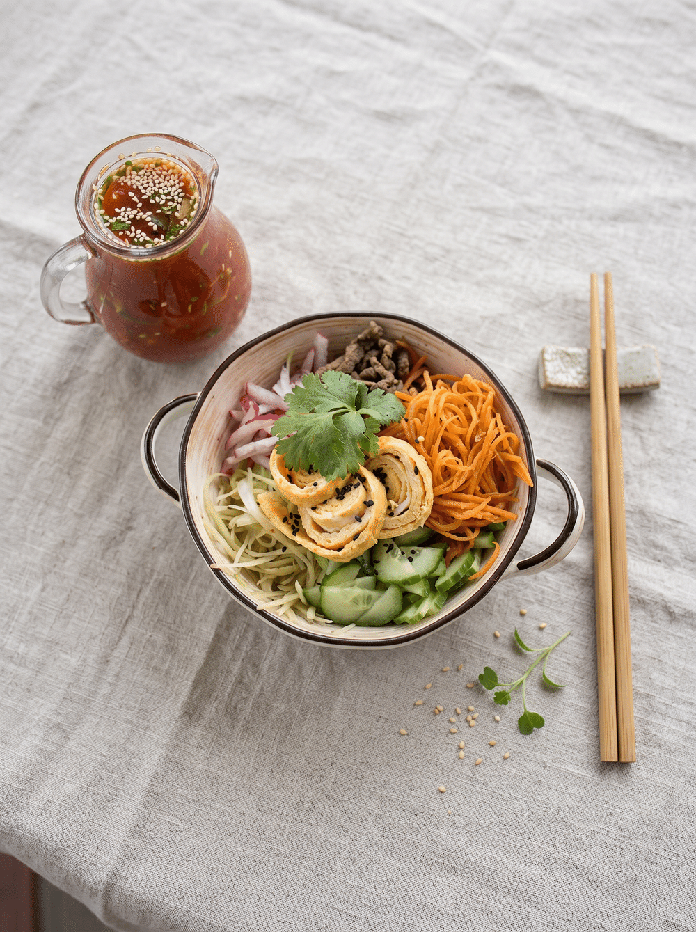 Традиционное корейское блюдо, освежающий холодный суп с лапшой и множеством ингредиентов.